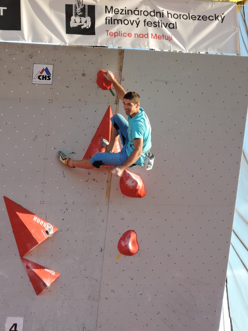 Večer se vyjasnilo a mírně ochladilo, chlapům (a fotografům) už z boční strany svítilo přes zástěnu na bouldry slunce. Poměrně dost diváků se usadilo na rovné louce před pódiem a moderátor se je snažil vyhecovat k nějaké té podpoře. Závodníci měli pět minut na pokusování a pět pauzu.