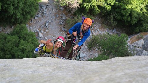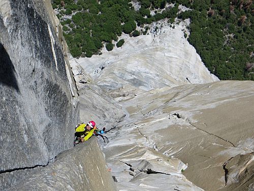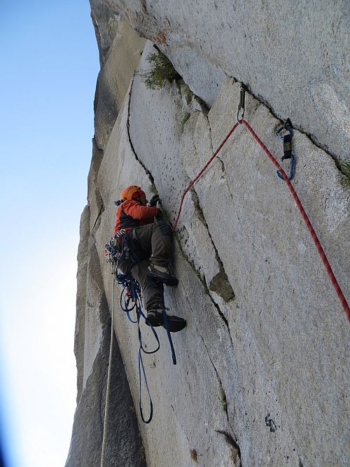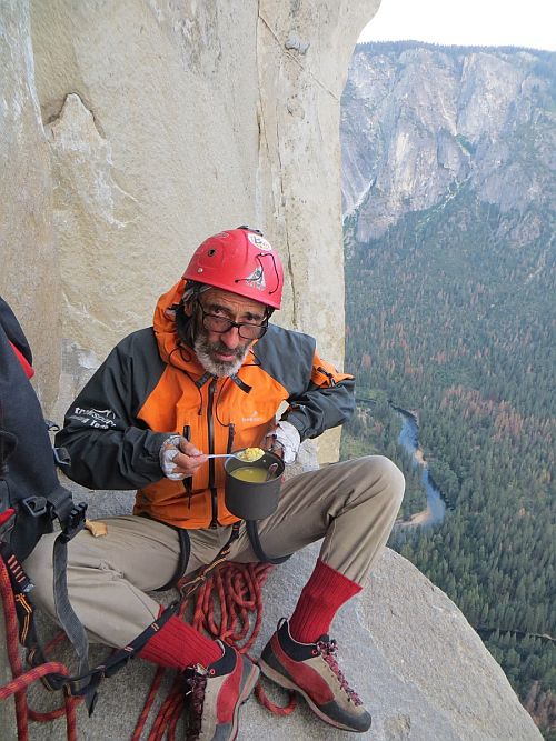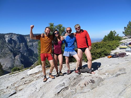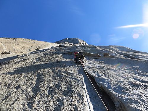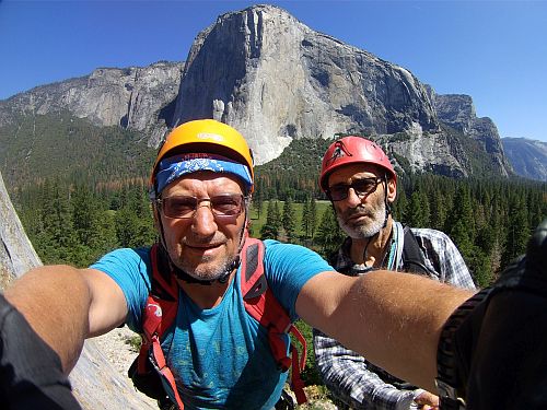 Vlado bol kedysi špičkový horolezec, teraz je hlavne výborný jachtár, ktorý už oboplával aj okolo sveta. Ale posledné roky sa k lezeniu vrátil, aby si spĺňal horolezecké sny svojej mladosti. Má za sebou SZ stenu Half Domu, Triple direct a Salathe na El Cape. Teraz mu k plnému šťastiu chýbal originál cesty Nos. Tak sme ho vyliezli! A to sme netušili, aké veľké prekvapenie nás čaká na vrchole.