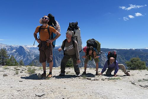 Pomohlo povzbudzujúce slovo a rady, že je to celé v pohode, len treba zachovať kľud. Pomohli sme trochu s ich obrovskou batožinou v ľahkom teréne a hlboko v noci sme si urobili spoločnú vrcholovú fotku plnú radosti z prelezenia cesty a nášho priateľstva. Bez neho by bol každý výstup oveľa chudobnejší, spoločné zážitky a emócie sú vždy silnejšie. Keď sme sa na druhý deň s obrovskými báglami doplahočili na oficiálny vrchol El Capu na turistickom chodníku, dostal som nápad na zaujímavú fotku. Celé naše dobrodružstvo sa zomlelo práve takto a my štyria sme sa museli spolu ocitnúť na tomto mieste preto, aby sme pochopili evolúciu bigwallového lezca! Môžete to úplne jasne vidieť na našej poslednej fotografii.