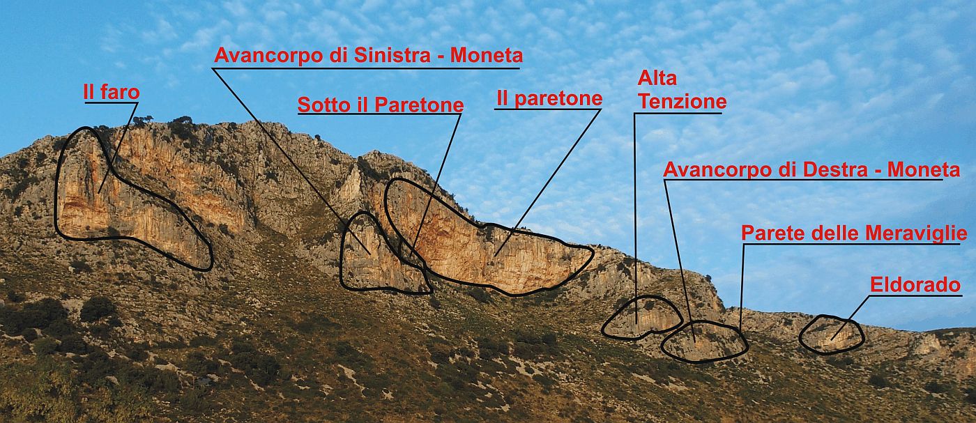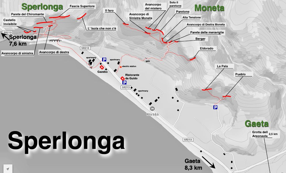 Název Sperlonga je brán jako název celé oblasti, ale hlavně je to skupina sektorů na levém křídle svahu, které zleva (díváme-li se od moře) ohraničuje pláž a klesá do moře. Střední část jakoby přímo nad centrální pláží je pak nazývá masiv Moneta.