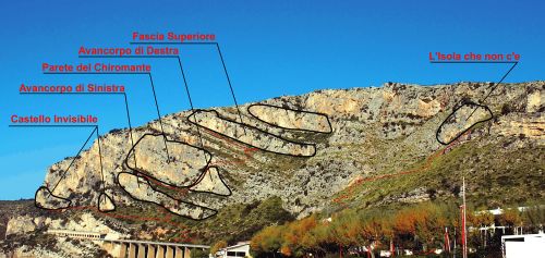 Cestička stoupá doleva k nejnižšímu sektoru Il Castello Invisibile. Od něj se dá jít doprava stoupajícím krátkým výstupem na rampu pod skalní pyramidu Avancorpo di Destra. A odtud doleva výše k nejnavštěvovanějšímu sektoru v tomto masivu Parete del Chiromante.