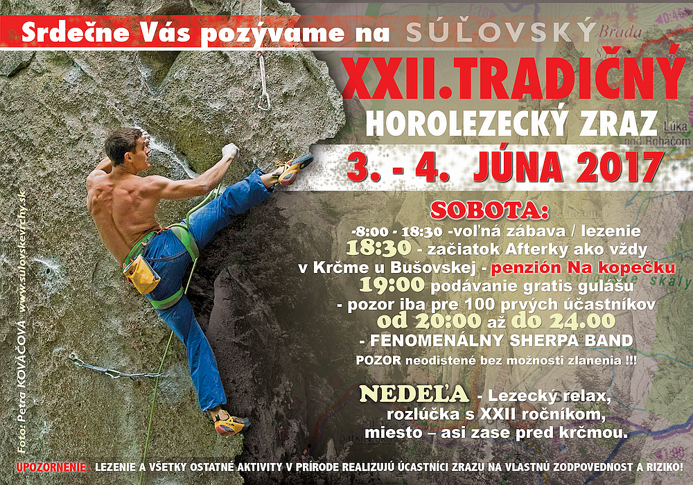 Tradiční horolezecký sraz se letos na Slovensku v Súľově chystá na 3. a 4. června. V pozvánce organizátoři slibují kromě volné zábavy večerní after párty s grátis gulášem (pro prvních 100 účastníkú).