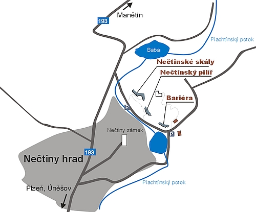 Z obce Nečtiny na jih asi 1,5 km po silnici 193 na Úněšov, 50 m za serpentinou odbočit doleva (po asfaltce za rybníkem) a dál asi 200 m. Nalevo míjíte sektory Nečtinská stěna a Nečtinský pilíř naproti rozvalinám mlýna. Parkování je u horního rybníka, hned u něj je sektor Bariéra.