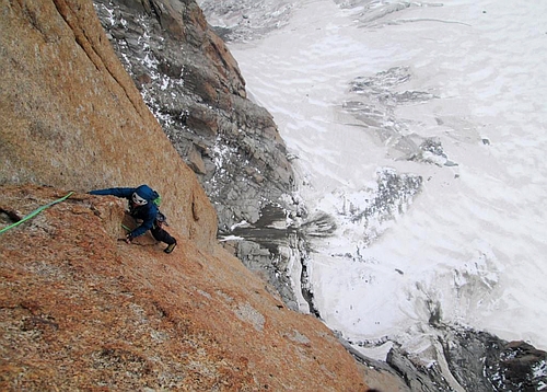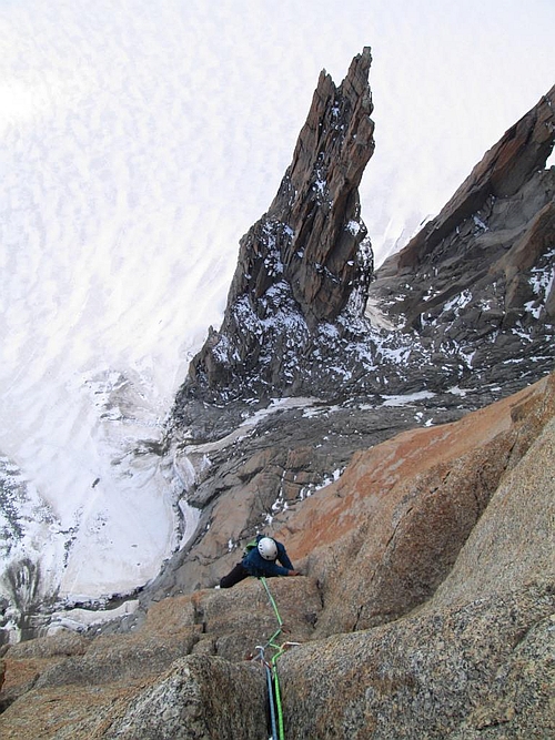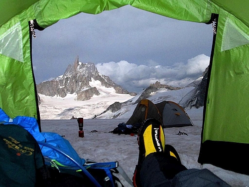 400m slaninování do mlíka. Radši prussik. Házim lano na hlavu Arnaudu Petitovi. Přísnej bivak tu rozjeli. Nemáte toaleťák, hoši? Co ste lezli? Bonatti? Jo ta spára za 7a, tam spadne každej, i 8béčkař, takže klid..Ahoj Nino. Zapínáme čelovky. Ground zero. Není v těch lezačkách na sněhu zima..? Uff. Je to tam. Stan. Chilli noc carne a malá plzeň. Orgazmotron.
