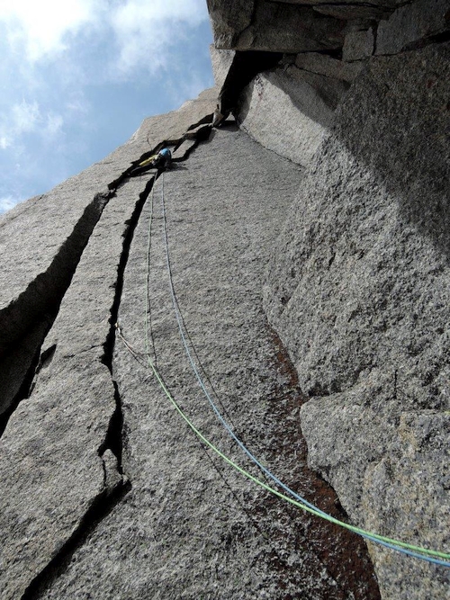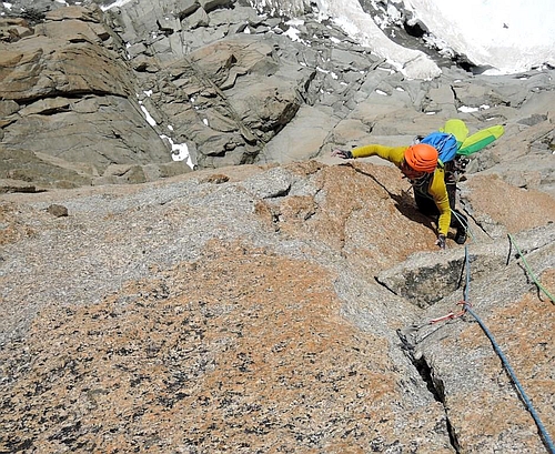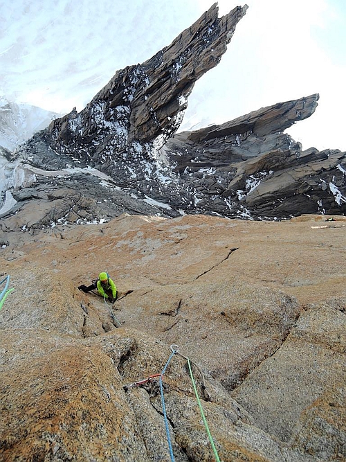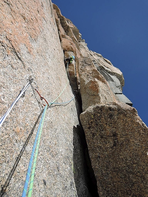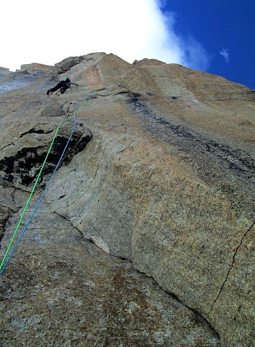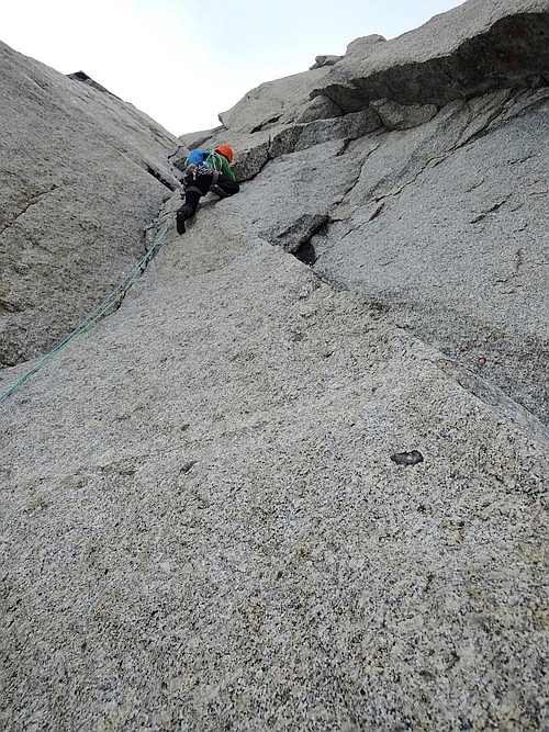 Nespíme. Hlava bolí. Pijem. Mrzne. Ráno. Sunshine. Go go go. Bonatti-Ghico 7a+. Oldschool grading a srdíčko s křidýlkama. Nástup. Vůkol šutry letí. Někdo ve Švýcarce zprdeleklikumá. My raději direktálně. Poético-mánia 3 dýlky. Ve spáře vodník. Traverz ve sporácích, srdíčko v krku. Ale vono to pude. Rovnou do jeskyně na start Bonattiho. Hřebínek důle a hlavu vzhůru.