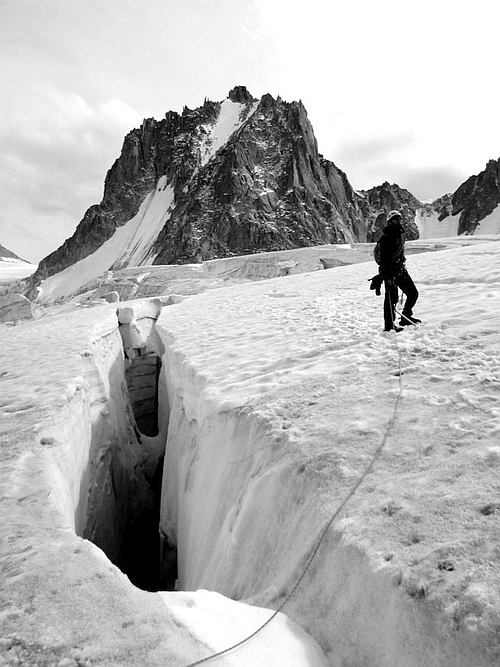 Den čtvrtý. Vorestováno? Tak Pointe Adolphe Rey nám eště chybí. Gervasutti 6a+. Sladká to tečka. Trhliny na přístupu. Moc trhlin. Objížďka po skále. Mačky skřípaj. Traverz. Police. Nástupovej štand. Je to vono..? Jo, určitě . Ladný koutek. Na pětku těžký. Asi únava. Super žabky v dachu, kde to jsme.