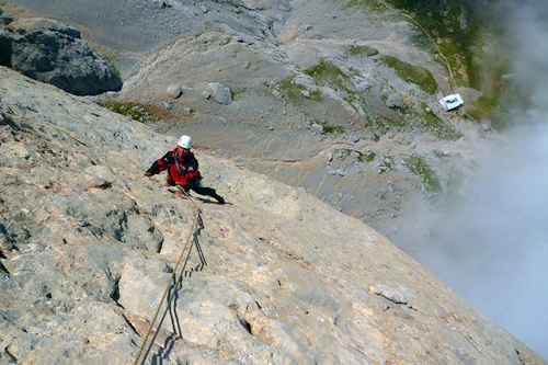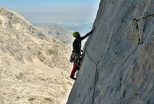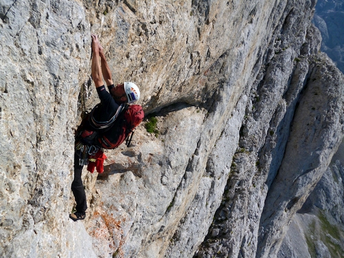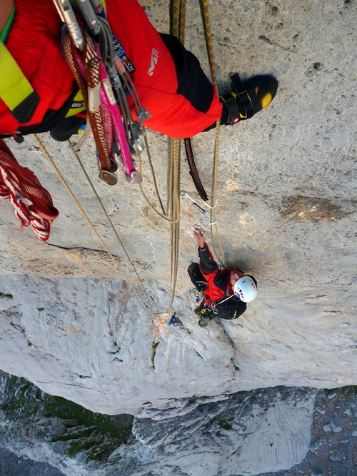 Ve 3. délce (druhé z dvou klíčových) mám namále, když stojím na malých stupech v mírně převislém koutě se spárkami, předloktí pomalu zrají a spásná skoba je v nedohlednu. Proč by tu také byla, když lze místo zajistit vlastními prostředky? Poslední friend je pár metrů pode mnou, ale ve vápenci jim nevěřím od doby, kdy lektor na instruktoráku v Prielschutzhausu demonstračně vytrhl jednoho ze spáry rukou. Šmátrám vklíněncem ve spárce, pětka ne, tak šestka, taky ne, spárka je příliš mělká a otevřená - Míro bacha, možná půjdu – zkusím tuhle vedle, trhám celým svazkem čoků, vklíněnec drží – expreska, modré lano, sedám! Připadám si na konci sil a vyklepávám. Délka pokračuje převislým sokolíkem v koutě, ale stupy se naštěstí zvětšují. Do skob na štandu se zavěšuju vycucnutý jak hašlerka. Jeden ze Španělů zatím pytlí druhou délku, když se mu nedaří udělat jeden nepříjemnější silový krok v převísku a následně slaňují. Trochu se nám uleví, že nebudeme muset před nikým uhánět.