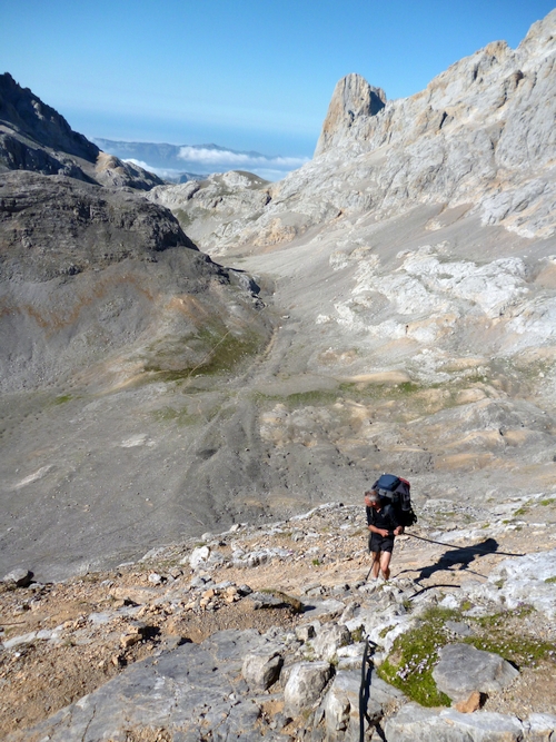 Díky zpoždění i mého náhradního letu (radosti letecké přepravy v letní prázdninové sezoně) nestíháme poslední lanovku v 19:45 a dnes přespíme tedy na parkovišti v údolí. Výhled na 900 metrů vysokou vápencovou bariéru, za níž se rozprostírá střední část masivu Picos de Europa je impozantní. Ze spacáků vylézáme dříve, než je začnou zahřívat sluneční paprsky. Chceme jet první lanovkou nahoru, ale ani tak není kam spěchat – provoz začíná až v 9 hodin. Batohy s matrošem a jídlem na týden váží každý přes 25 kg a když se kabinka s lehkým zhoupnutím zastaví v horní stanici, jsme vděční, že jsme si téměř kilometrové převýšení nemuseli vychutnat pěšky. Teď zbývá již jen čtyřhodinový pochod na chatu.
