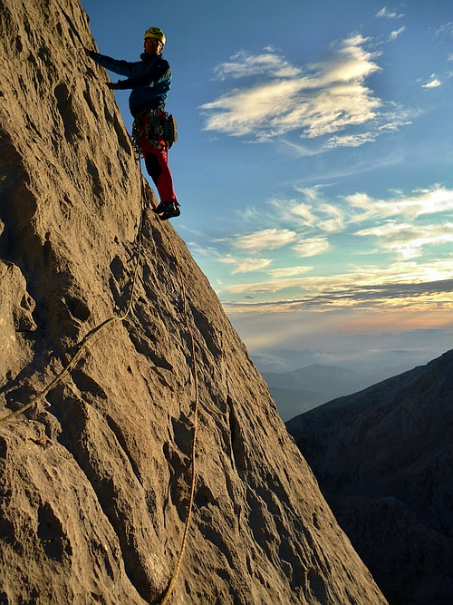 Když ráno pod stěnou ve tmě půl hodiny čekáme na rozednění, od chaty se naším směrem odlepují dvě světélka. Budíček ve 4 ráno se přece vyplatil – budeme v cestě první! Do úvodní délky nastupuju za pološera, nechceme dva španělské borce příliš zdržovat. Ze stejného důvodu si povoluji jen jeden pokus navíc, když odsedám (naštěstí do nýtu) u prvního těžkého místa 10 metrů nad nástupem. Ruce zebou, ale 6c v 6:30 ráno je samozřejmě má oblíbená disciplína. Kupodivu mně to pouští (bude to asi lehčí), a po krátkém hekání u skalního bříška pod 1. štandem začínám Míru dobírat.