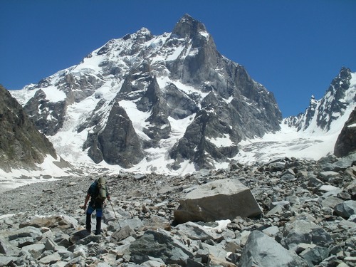 Mazeri vyřizujeme potřebné povolení u pohraničníků a pak nás taxi vyveze ještě ke staré turistické chatě nad Mazeri. Odtud už musíme pokračovat po svých. Každý máme zhruba 40 kg na zádech. Cesta do základního tábora pod ledovec trvá asi pět hodin.  Vede nádherným údolím kolem horské řeky a vodopádů. Každý si jdeme svým tempem. Nejrychleji vyrazil Dalibor, který ale na první odbočce zvolil špatný směr a vydal se – kdo ví proč - do Ruska.  My s Ríšou tudíž ani nevěděli, že jsme ho předběhli, a mysleli si, že jde ukrutným tempem stále před námi. Jaké bylo naše překvapení, když jsme došli na ledovec a Dalibor nikde. Po asi hodinové debatě, zda se utopil v brodu nebo ho sežral medvěd, se Dalibor k naší úlevě objevil.