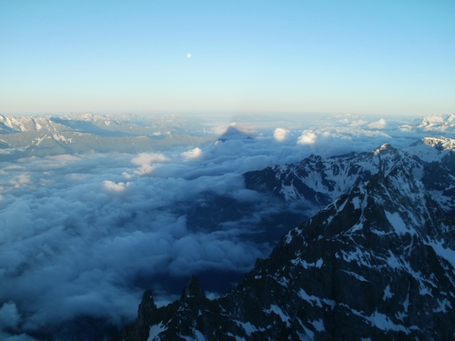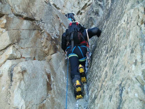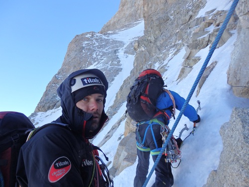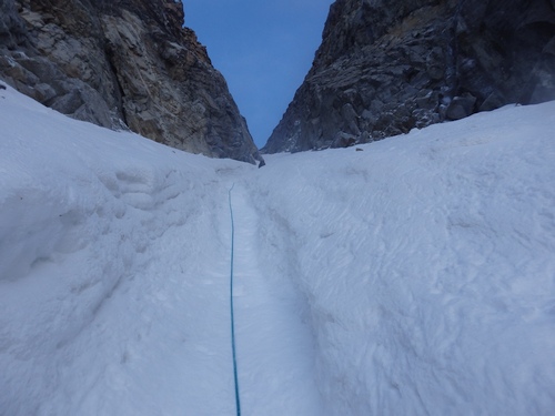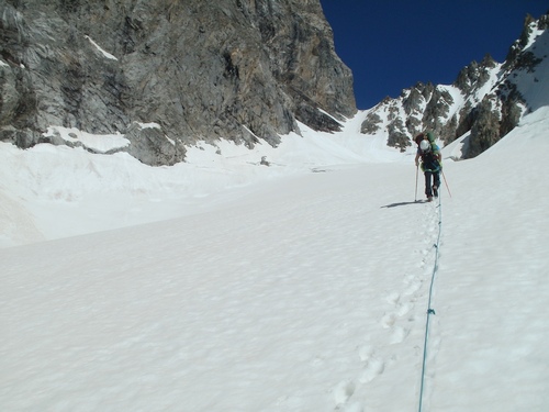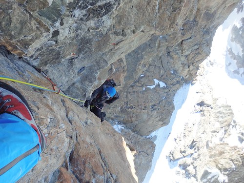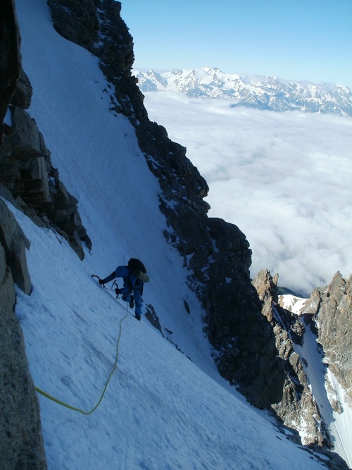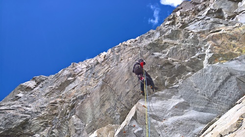 Brzy ráno konečně nastupujeme do stěny. Cesta začíná sestupem asi 100 m firnovým kuloárem na druhou stranu. Pak následuje traverz ve skále do dalšího kuloáru, který nás asi po 300 m vyplivne za zubem Mazeri. Odtud je možné pokračovat rozlámaným hřebenem až pod headwall. My v rámci urychlení volíme výstup systémem firnových kuloárů vlevo od hřebene. Vedení se ujímá Ríša. Sklon je nekompromisní – 60 až 70 stupňů. Naštěstí máme až na pár výjimek dobré štandy ve skále. Pod headwallem jsme večer. Místo na bivak je horší, ale o to vzdušnější než v sedle Mazeri.