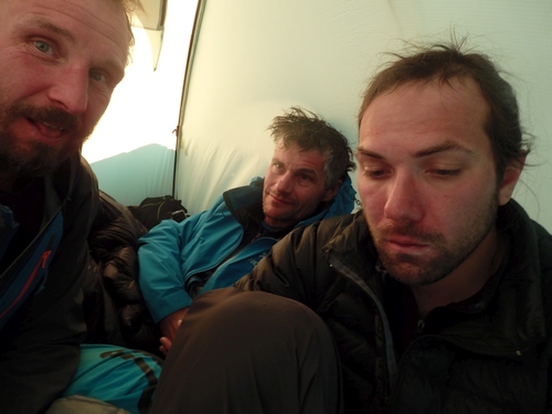Na další dny je hlášeno zhoršení počasí. Vracíme se do BC, kde se potkáváme s Letošem a Pítrsem.  Béda vzdal čekání na batoh a vrátil se do Čech. Čtyři dny čekání na počasí krátíme vařením, procházkami k vodopádu a nekonečnými debatami kudy nahoru. Původní plán na cestu Mischlayev jsme zavrhli z důvodu padajícího kamení v centrální části stěny. Jako nejlepší varianta výstupu se nám jeví jižní hřeben vedoucí ze sedla Mazeri.