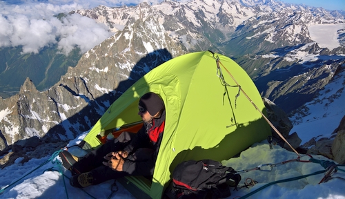 Ráno nás čeká převislá stěna, kterou překonáváme cestou místního borce Khergianiho. Pro tyto účely s sebou táhnu i lezečky, ovšem v mínus šesti se mi do nich opravdu nechce. Nastupuje tedy zkušený technický lezec z Yosemit Dalibor a s heslem „na čistotu se…,  na vrchol se deru“ zdoláváme čtyři nejtěžší délky celkem rychle. Posledních deset délek na vrchol vyšlo na mě. Věci na bivak jsme nechali pod headwallem, takže máme jen jeden pokus. Nastává závod s časem. Síly rychle ubývají a vrchol stále v nedohlednu. Mixové pasáže střídají strmé firnové svahy. Po poslední mixové délce nacházím tabulku Ušba Južnaja s pamětním nápisem a raduju se, že jsem na vrcholu. Zpoza skály na mě ale vykoukne další dlouhý hřeben. Naštěstí to není tak hrozné a společným postupem jsme za chvíli na vrcholu. Je pět odpoledne a nás čeká nekonečné slanění zpátky do bivaku. Po několika infarktových situacích, kdy se nám zaseklo nebo zamotalo lano, jsme v deset večer v našem orlím hnízdě.