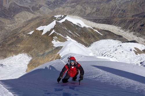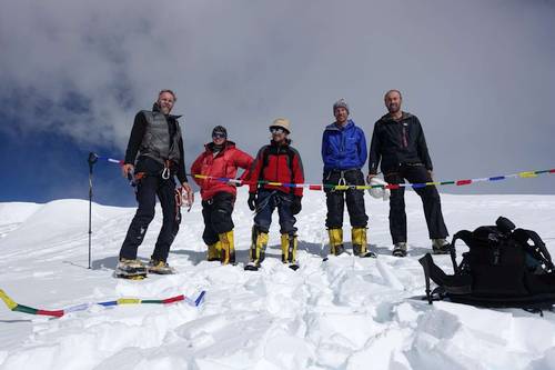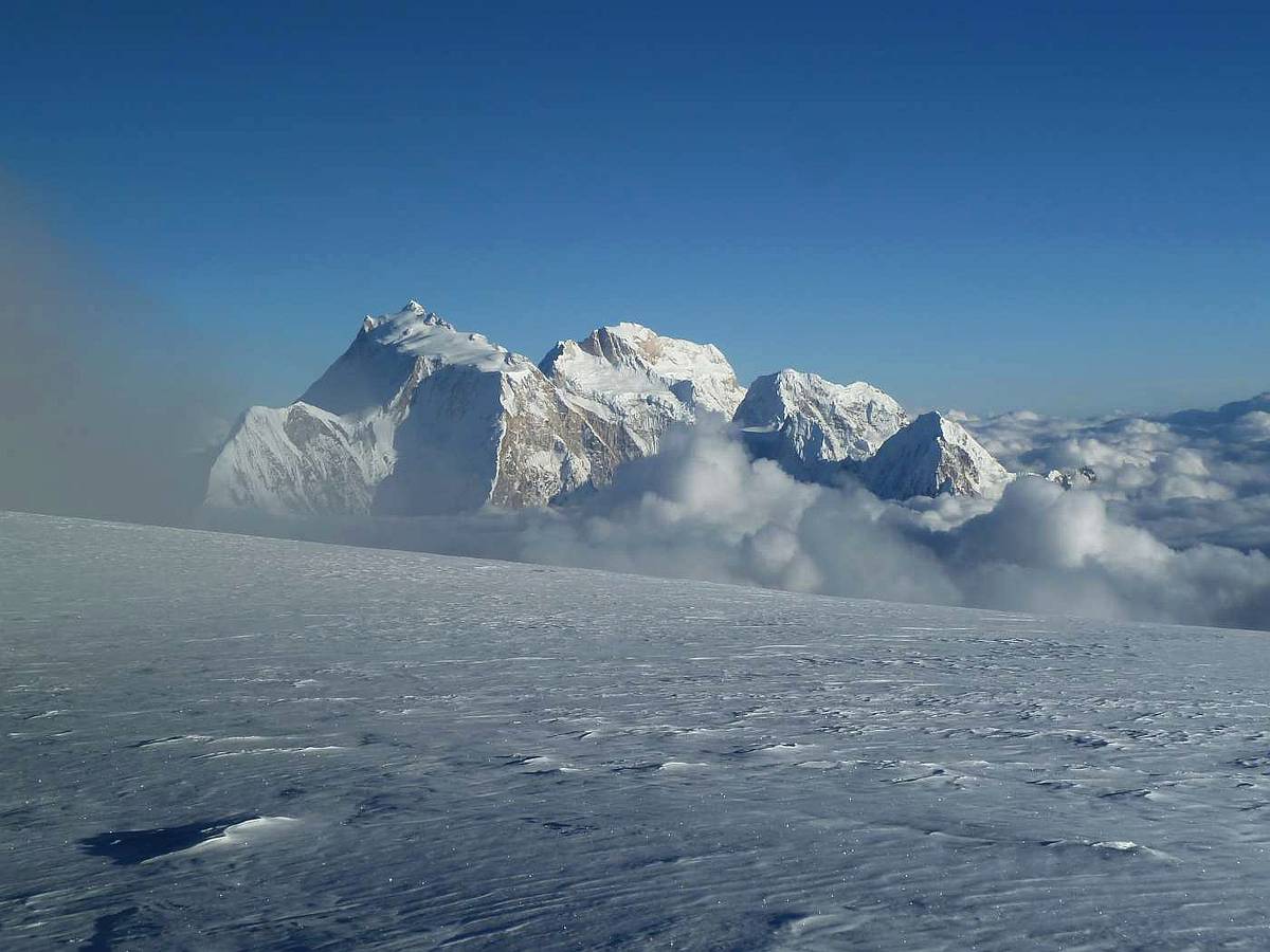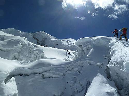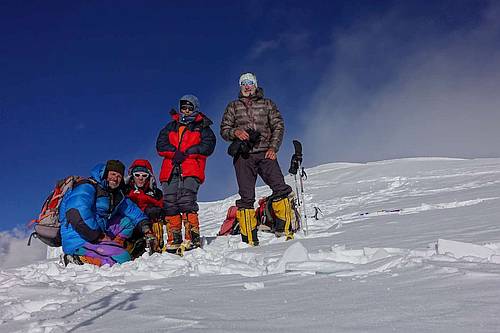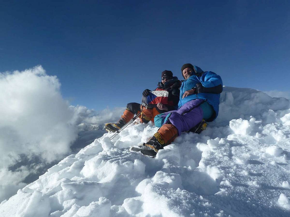 Za dva dni jsme v místě našeho posledního tábora v 6100 m a třetí den stavíme poslední tábor výš, asi 6300 - 6400 m n.m. Ráno vyrážíme postupně vzhůru. Trhlin již ubylo, ale ještě dost dlouho strmě stoupáme, až se dostáváme na téměř rovný, několikakilometrový úsek vedoucí k vrcholu. Olga s Pavlem jsou poslední, zato se zde, asi kilometr před vrcholem, potkávají s Tondou a Laňkem přicházejícími po hřebeni. I při velké snaze by se to takto nedalo dopředu naplánovat, ale je to tak. V rozsahu dvou hodin vystupujeme všichni dvěma cestami na vrchol. Přes občasné mraky jsou krásné výhledy. Na východ kousek od nás sedmitisícovka