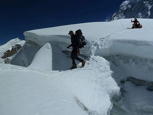Dva dni věnujeme stavbě a vybavení našeho BC, chystáme si věci, obhlížíme další cestu. Vypadá to dobře. Třetí den jdeme nahoru. Tonda s Laňkem (Antonín Bělík a Vít Auermṻller) variantou západního hřebene a nás zbývajících 7 se pouští do hledání cesty severozápadním ledovcem. Ještě ve spodní části cesty nacházíme postupně dvě trasírky, zřejmě jako pozůstatek prvního pokusu z roku 2003 a pak již jen kličkujeme a hledáme cestu velmi členitým ledovcem. Po třech dnech si necháváme část věcí jako depozit (6100 m n.m.) a vracíme se do BC. Cestou několikrát zahlédneme Tondu a Laňka jako malé tečky na hřebeni a oni zase pozorují nás a naší stopu jak se klikatí ledovcem.