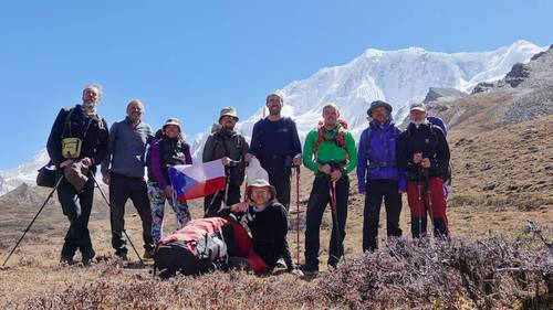 Společná fotka pod BC na odchodnou, v pozadí „náš Gogo“ (Gyaji Khang se blbě vyslovuje)