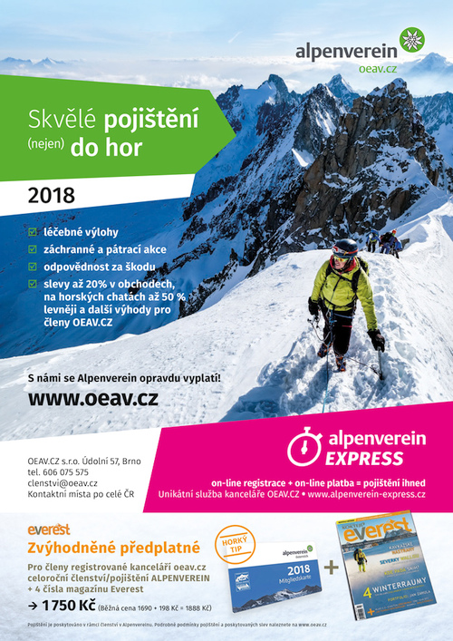 Staňte se členy rakouského Alpenvereinu, připlaťte si pouhých 60,- Kč a máte čtení na celý rok. Alpenverein jistě netřeba představovat, nicméně veškeré podrobnosti, podmínky a online objednací formulář naleznete na http://oeav.cz. Využijte až 20% slevy v outdoorových obchodech a další řadu benefitů. Novinka: Vyřiďte vše online a buďte pojištěni ihned bez dalšího čekání! http://oeav.cz/express
