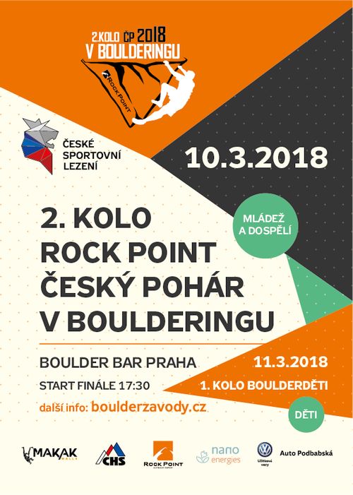 Kdy: 10. a 11. března 2018 Kde: Boulder Bar, U Výstaviště 230/11, Praha 7 Holešovice Co: 2. kolo Rock Point Český pohár v boulderingu, 2. kolo ČP mládeže, 1. kolo Boulderděti 2018