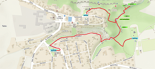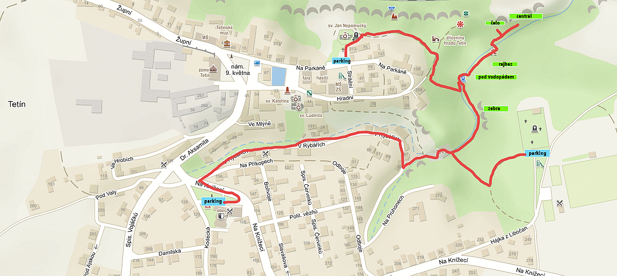 2. Za obecním úřadem - cesta vede podél potoka údolím až dolů k čističce. Kolem čističky se schází dolů opět podél vodopádu na schodiště.