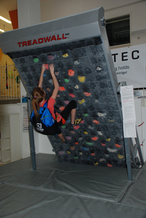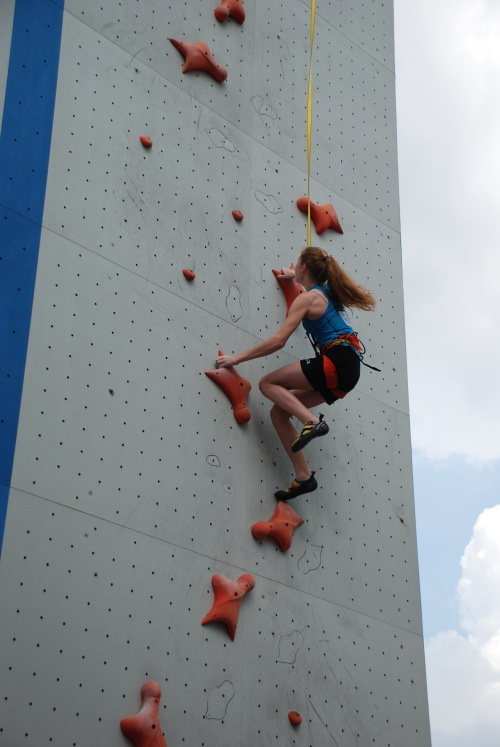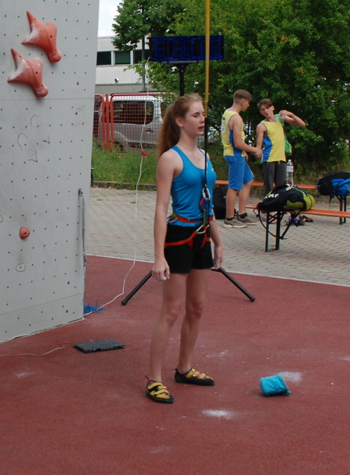 Nejdříve nastupuje v kategorii „B“ ke svému prvnímu soutěžnímu pokusu na pravé cestě naše největší naděje Terezka Cibulková (Climbing Technology, Saltic, Beal) a dává čas jedenáct a půl vteřiny, což je sice daleko od Terezčina osobáku, ale je to teprve první pokus a na postup do finálové osmičky by to zatím stačilo.