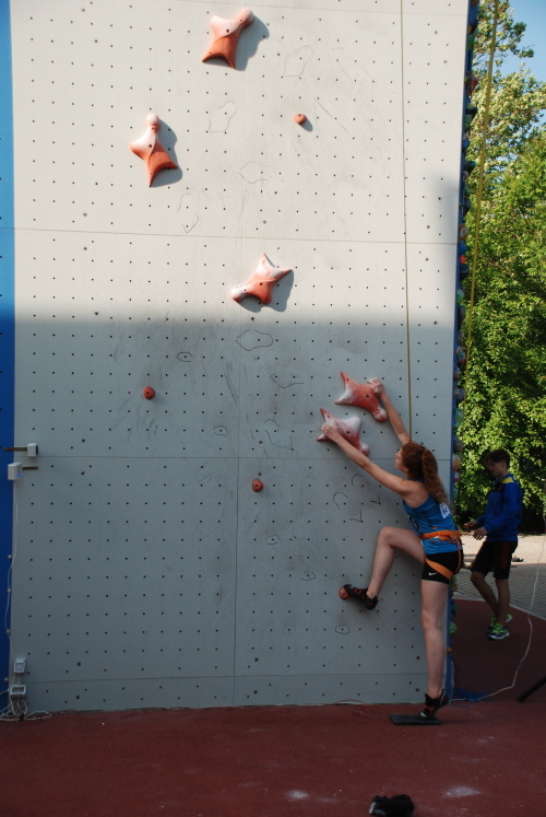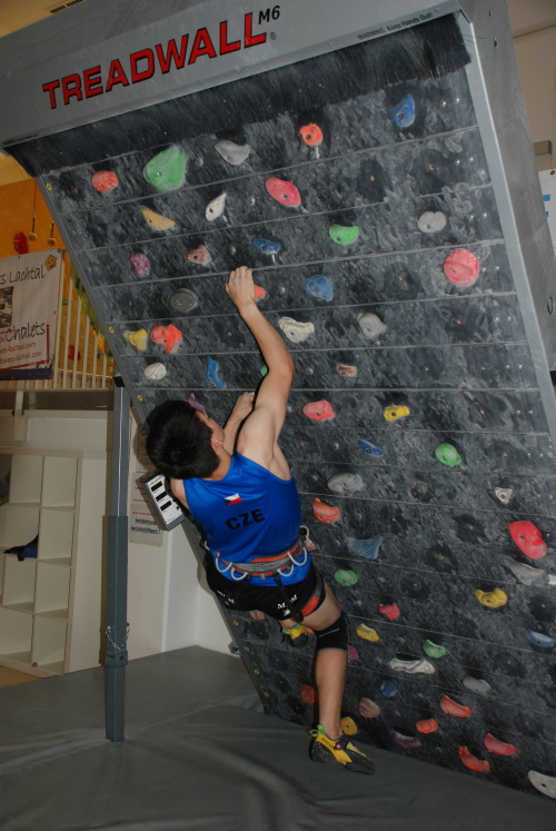 Zde se děcka snažila přivyknout prsty na originální chyty a hlavně potrénovat starty na profi časomíře. Ale jak chcete za tak krátkou chvíli dohnat celoroční přípravu soupeřů na certifikovaných stěnách?!