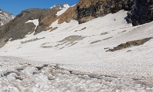 Chtěli jsme si udělat aklimatizační túru, tak jsme nejeli lanovkou na Felskin, jak nám radil kamarád, který to tam má prochhozené, ale zvolili jsme Glacier Trail a s batohy „na těžko“ jsme ostře stoupali od Mattmark See na Schwarzbergschopf 2870 m, abychom pak sestoupili o pár desítek m na ledovec a namířili k místu plánovaného bivaku pod Britannia Hütte. Jenže příjemná představa procházky po firnu se změnila v komplikované překonávání ledovcových louží a potoků na ledovci, do kterého celé dny pere červencové slunce. Přestože jsme šli po značené cestě, místy bylo obtížné jít dál, bylo nezbytné v okolí louží a vodotečí zvažovat každý krok, protože jsme se bořili do mokré břečky a místy se propadali do vody. Přeskakovali jsme a opatrně našlapovali. Cajk. Vypadalo to, že nejhorší máme za sebou. Pak ale přišlo místo, které nebylo moc kudy obejít. Tak jo: odrazit, přeběhnout. Zabořil jsem se hluboko, pleskl sebou do vody a bágl mne přiklepl do mokrého chladu. Rychlý skok ven. Klika, boty jakž takž, ostatní uschne. Jitka to nakonec přeci jen obešla, ale nevrátila se do mojí stopy a když se probořila, hodně si nabrala do pohor. Pak už jsme firn zvládli, ale čekal nás ještě svižně tekoucí potok, který jsme překonali po viklavých kamenech. Pak už celkem klidně dorazíme na morénu pod Britannií. Stavíme stan na firnu. Najíme se. Stmívá se a nastavuji budík na tři ráno.