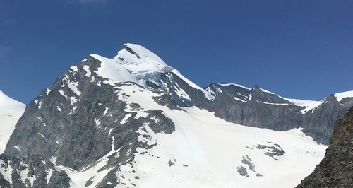 Vyrážíme s ostatními. Sestoupíme k ledovci, obujeme mačky, vezmeme do ruky cepíny a postupně stoupáme po objevujícísch se stopách vinoucích se firnem mezi kusy ledu. Sem tam překonáváme trhliny a traverzujeme strmý firn z dálky se zcela nevinně tvářícího kopce. Přemýšlím, jak bude probíhat sestup. Tento terén vyžaduje soustředění a nebude tolerovat chyby. Vystoupáme kolem mohutných séraků do sedla, kde začíná být zima a foukat ledový vítr. Oblékáme péřovky a čepice a vyměňujeme rukavice za silnější. Vystupujeme po dlouhém ale již posledním hřebeni na vrchol a zdravíme se se skupinkou Švýcarů a navzájem se fotíme. Moc nepobydeme, je tu frišno. Jdu poslední, zlehka napínám lano a vybízím k maximálnímu soustředění na každý sestupový krok. V nejstrmějším místě Jitka přede mnou lehne na bok a zapře se mačkami. Nevím, co se děje, ale bleskově zapichuji cepín s přehozenou smyčkou lana až po hlavu do firnu a kontroluju situaci. Jitka vyjela na Láďu, co blbne. „To nic, jen malé škobrtnutí.“ Otáčím se na Láďu: „Podívej se dolů: strmý svah něco přes 45° a hrana, za kterou není vidět. Mohou tam být trhliny.“ „To mohl být průser…“ Pak už každý krok na jistotu.