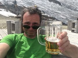 Po cestě jsme narazili na „balvany" ledu, zbytky séraku, co se utrhnul včera (to dunění bylo slyšet až na Weissmiesu a teď jsme věděli, odkud to šlo). Následoval komplikovaný sestup mezi séraky a ledovcovými trhlinami, sníh změklý od poledního slunce. Místy jsme cestu museli vymyslet a najít, Po 2.5 hodinách jsme dorazili na Längfluehütte, jedno pivo do každé nohy a dolů lanovkou do Saas Fee.