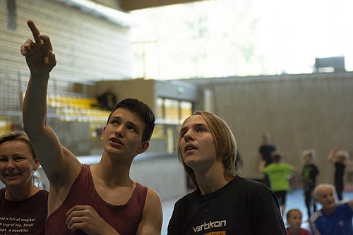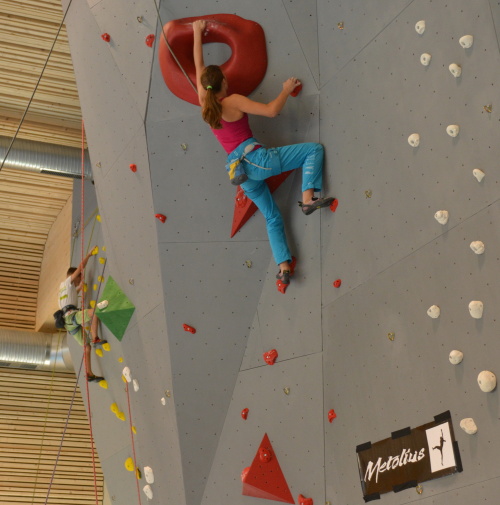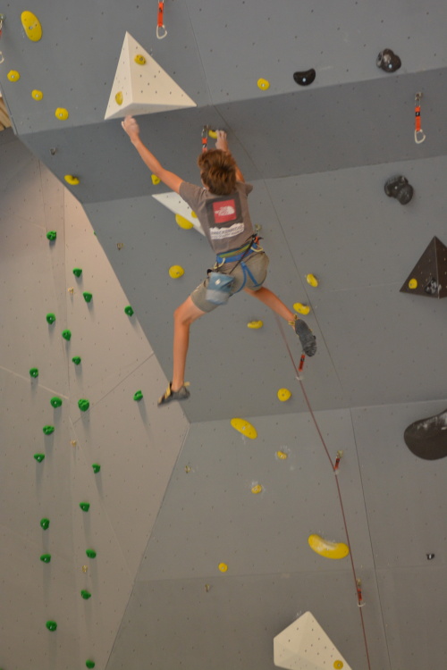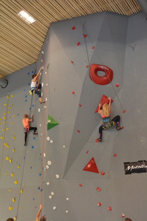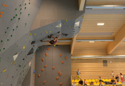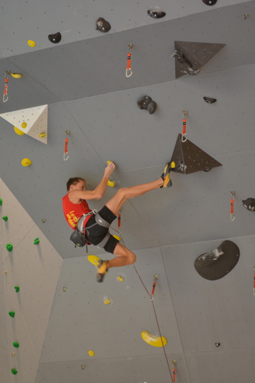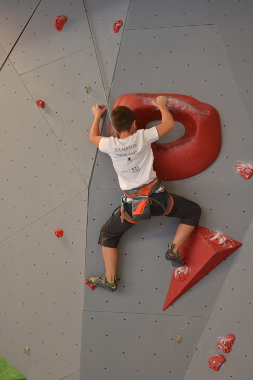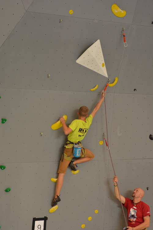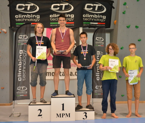 Následovala společná fotka, předlezení soutěžních cest a šlo se závodit. Pro závodníky bylo, jak je u MPM zvykem, nachystáno deset soutěžních cest, z toho každá kategorie lezla pět. Cesty postavil další domácí odchovanec, ač věkem mladý, přesto velmi zkušený stavěč Martin Chytil. Cesty byly podle ohlasu pěkné a soudě dle výsledku i obtížnostně dobře trefené tak, aby si závodníci vydatně zalezli a současně aby se výkonnostně rozřadili. Až na malé výjimky se to v základní části soutěže povedlo a i ti, kteří se museli rozřadit v závěrečném „rozstřelu“, se rozřadili lezeckým výkonem a nikoli časem. Pro mě osobně pak bylo velice příjemné sledovat družnou atmosféru mezi lezci, kdy si navzájem radili, hecovali a povzbuzovali i závodníci ze stejné kategorie, kteří vlastně byli navzájem soupeři.