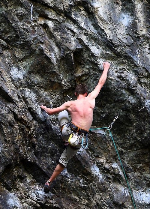Podzim nám konečně nadělil několik chladnějších dnů a mělo smysl se pouštět do nejtěžších cest. Obtížnost cesty River Raid, 8b+  je v převislém vytrvalostním lezení, kde skoro na konci převisu přichází nejtěžší boulder s dynamickým dvojšahem do mělké prstové jamky zvané „brejle“.