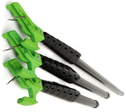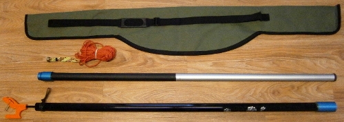 Teleskopické šáhlo ve třech provedeních /složené 55 cm 74 cm 113 cm/. Výrobcem je britská firma Beta Climbing Designs. V letošním roce tento svůj letitý produkt kompletně inovovali. Karabina expresky se vkládá do vybrání v plastovém véčku a otevřený zámek drží drátová pružina. Funguje pro nejčastější /střední/ velikost karabin, největší se nevejdou. Velmi dobrý systém na vápno, testoval jsem letos tuto novou verzi v nejdelším provedení ve Frankenjuře a funguje výborně.  Nejkratší provedení má sice jen 238 cm, ale velkou výhodu. Složených 55 cm se dá strčit do batohu a vzít s sebou do letadla. Doporučení - při použití celé délky nejdelšího šáhla zavěšovat jen jednoduché lano. Zatížení je poloviční a šáhlo se neprohýbá. Zajímavé, že výrobce tuto možnost neuvádí. Cvaknutí jednoduchého lana provedete stejně jako u následujícího šáhla 9,2 m na písek. Výborné na vápno, ale i nejdelší provedení je příliš krátké na písek. Orientační ceny 60 E, 80 E, 100 E. Bohužel nenašel jsem dostupné na tuzemských eshopech a je nutno hledat v zahraničí.