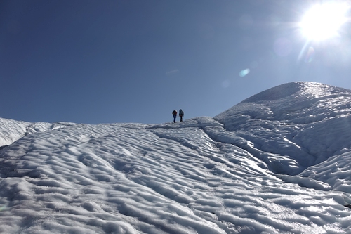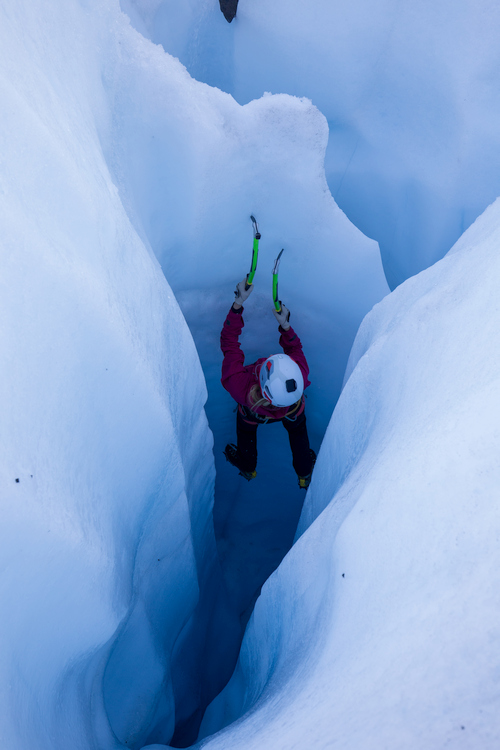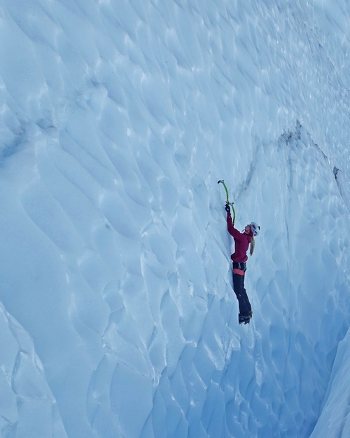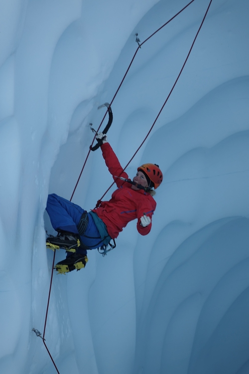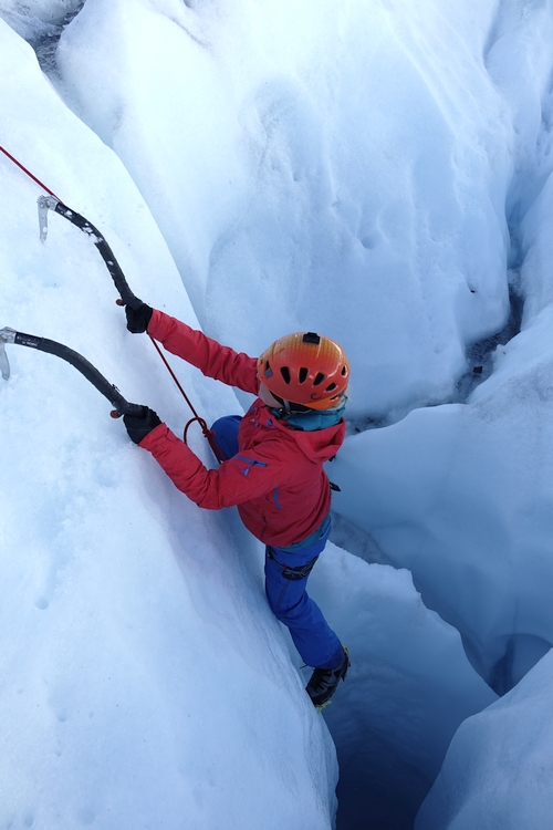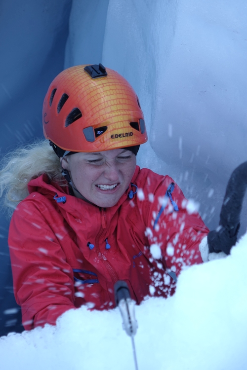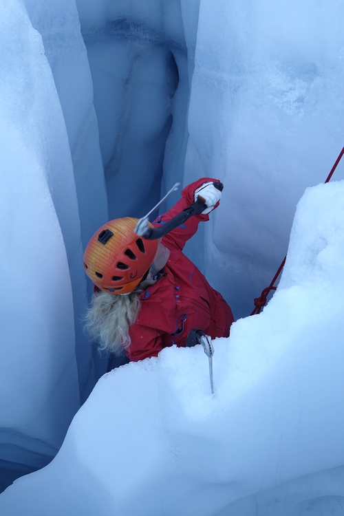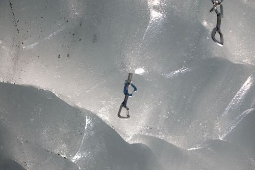 Když už to vypadalo, že bych mohla zkusit znovu lézt, vyrazili jsme zpátky na ledovec. Já jsem si lezení zpestřila i plaváním, když jsem spadla do ledové trhliny plné vody. Poté, co mě Lucka z trhliny vytáhla jsme si tedy museli otočit zase zpátky. Újmu na zdraví jsem sice neutrpěla, zato Lucka utrpěla újmu co se počtu ponožek týká. Všechny své ponožky totiž musela půjčit mně. Mokré boty totiž na ledovci jinak nevysušíte.