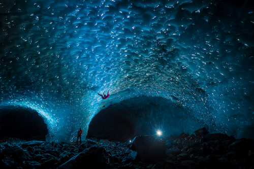 Po dobrodružství na lodi pokračuje naše pouť na další ledovec. Tentokrát je to Byron glacier, kde máme v plánu lezení na ledovci a v ledové jeskyni, na kterou cestou narážíme. Jeskyně je krásná, jediný problém je, že je na její lezení poměrně teplo. I když je nebe bez mráčku, v jeskyni neustále silně „prší". Tedy to, že je teplo tvrdí Lucka. Mně i přes několik vrstev oblečení drkotají zuby zimou řádně po celou expedici. Zatímco Lucka připravuje cestu já zkouším natočit pár záběrů z drona. S ním se mi daří hned při druhém vzletu nabourat do skály, takže záběry budou jistě úžasné. 😉 V průběhu dne přicházíme na nové a nové problémy. S tím, že bude lezec i jistič po chvilce v jeskyni úplně mokrý, jsme počítali. Větší problém je, že než se povede Lucce navrtat šrouby do stropu jeskyně, vytávají ty, co navrtala ve spodku cesty. Zjišťujeme, že ani stav jeskyně se nám vůbec nepozdává vrchní část je spadlá a co chvíli něco z vrchu upadne. Padne tedy rozhodnutí, že se tu dál zdržovat je už moc nebezpečné. Lucka tak dolézá jen do půlky jeskyně a velíme k ústupu. Dozvídáme se, že nasledující dny jeskyně pomalu kolapsuje a dneska tam pravděpodobně i vlivem proběhlého zemětřesení není.