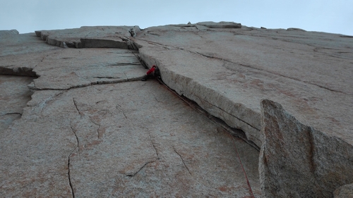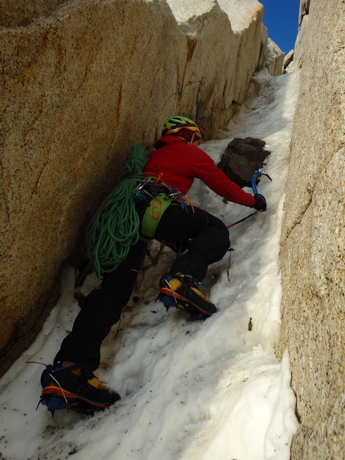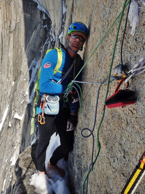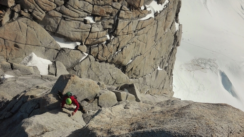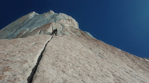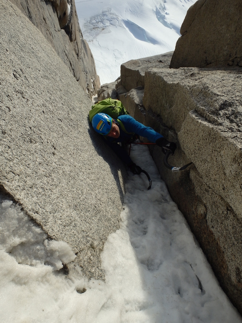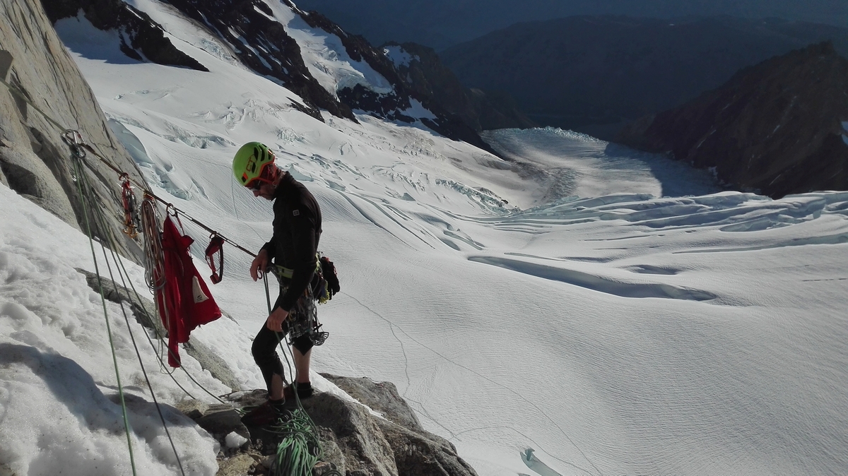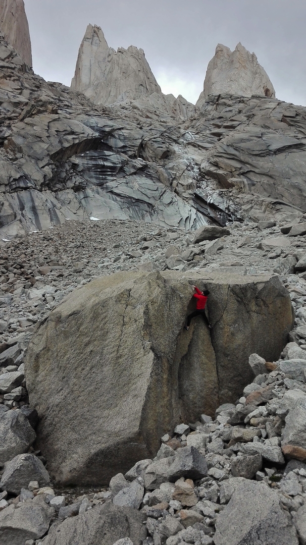 Pozor chlapče, pozor! Si obyčajný smrteľník z mäsa a kostí! Blikajú mi všetky výstražné kontrolky v hlave po desať metrovom páde s odlomeným veľkým kameňom, ktorý ma v lete trafil do nohy. Bolí to, ale noha nie je zlomená a tak doliezam dĺžku, ktorá končí tesne pod vrcholom veže Rafael Juárez. Sedím na polici, chladím opuchnutú nohu starým snehom vysekaným zo špáry a chvejem sa hrôzou pri pomyslení čo by sa stalo, keby som si meter pod tým miestom nezaložil pre istotu tutového frenda. Boháča veď ja som sa skoro zabil?! Mohol som spadnúť vyše dvadsať metrov priamo do traverzu v členitom teréne, plnom políc a kameňov! Áááá... Fuj!
