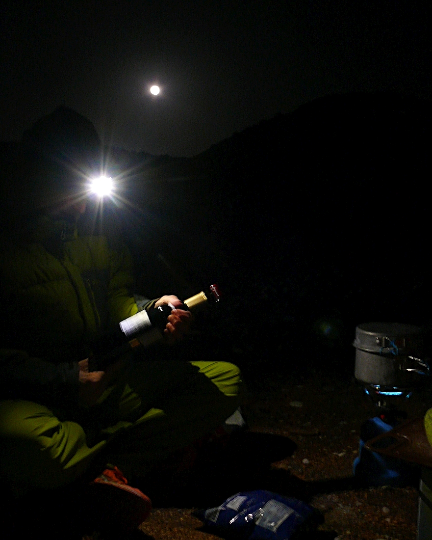 Večer nám poprvé do pánve svítí měsíc a ve třpytu hvězd se z internacionální Lidl etikety dozvídáme, že tentokrát děláme kohouta na zelí a kari s neslanými těstovinami. Lehce připíjíme na návrat do skal. Míhy se obloží dobrotama, ochutnává od všeho kousek a za chvíli se bojí, že se v noci pobleje.