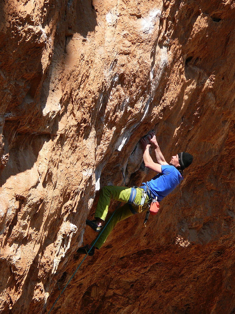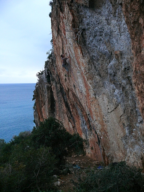 ÚT - Doporučení máme na Theos Cave. Orientace na jih, nebe bez mračen. Apeluji na rychlejší přesun do skal. Zas tak moc rychlí nejsme. Na parkovišti potkáváme Gendovce. Taky peláší co to jde, na řeči bude čas později. Stín mizí před očima jak pražský sníh. Konečně potkévám hezkou cestu na rozlez, Zeus 7a. Střídáme se na expreskách, Mihál rozjíždí sérii 6c až 7a. Já zaútočím na Turtle cca 8a, kde stín vydrží nejdéle. Na druhý pokus se proklepu k řetězu a Káje poradíme FLASH. Chytů je dost, ale musí se vybrat ty správné. Milanovi se bouldřík ani ve stínu, ani na slunci nepovede. Pak ještě ze zvědavosti prostupuji Mise en Place 8a po poledni již pěkně propečené. Bouldr a dolez za ježky, co víc si přát. Kája si to chce zkusit na flash. Říkám si buď to vyleze hned nebo vůbec. Dávám jí přednost abych případně presky vycvakal. Samozřejmě nejtěžší místo leze jinak, za krysy jí lítaj nohy vzduchem. No proč vlastně něco zkoušim radit. V horní rozpřažce dlouho laboruje, kousek jí chybí. Nakonec se rajbasem záhadně provlní a je nahoře. I přes výpek se k řetězu taky dohrabu, vycvakam a svištíme k moři. Kůže naštěstí vydržela, ale moc jí nezbylo.