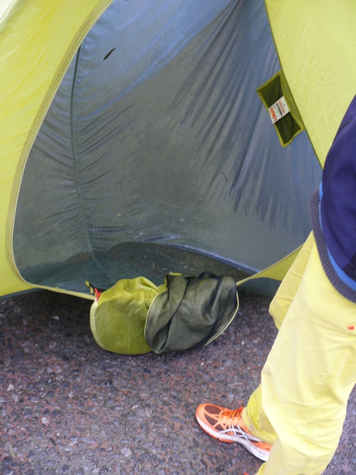 V noci začíná být trochu mokro. Vytrvale prší a voda útočí do stanu. Aby mi zůstaly kalhoty a péřovka suché, dávám si je do spacáku. Podlážku stanu pokrývá centimetrová vrstva vody, které moje vyfouklá karimatka nedokáže vzdorovat.