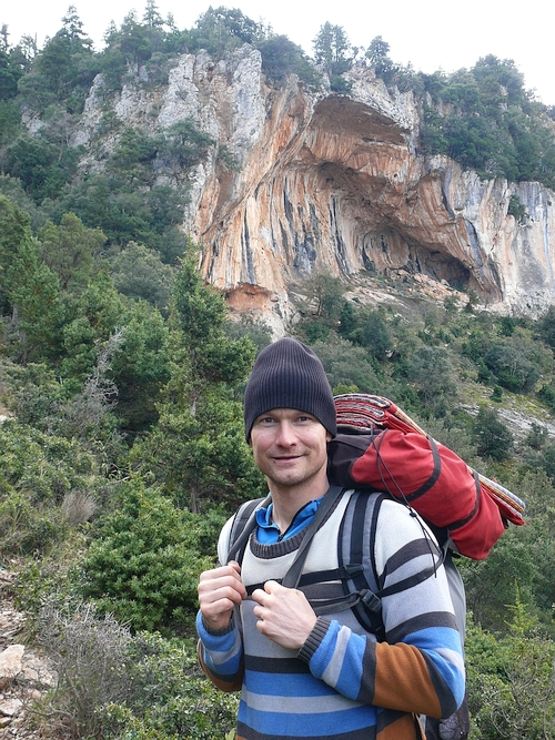 SO - Na sobotu hlásí příchod deště. V noci pociťujeme první mokro ve stanu. Ráno ještě neprší, ale je jen otázka času, kdy začne. Mihy stíhá tradiční dopolední běh s tradičně špatným časem. Za mrholení se vydáváme do Twin cave. Na rozlez v dešti Mihy pytlí u třetího prý 6b+, podle mě ani v průvodci nebyla. Čistý hnus. Nadšenci kvičí radostí v převisech, stihli přelezy nějakých 8a+, 8b. Nadšení jim závidím. Všude začíná být mokro, vítr honí déšť po všech věcech. Mihy nedolézá krásné, nahoře sprchové Vromika Myala, 7a+. Dál na lezení prdí, naštěstí je ochoten alespoň jistit. Poslední suché místo je v zabobkovaný jeskyňce pod nástupem fantastického 8a+ Tufandago , které prolézám a připravuji na „někdy příště“. Mihál se bojí, že budu chtít dát pokus. Trojice zlitých Srbů se zájmem o cestu trpělivě čeká. Z cesty se mi nechce, tolik hezkých kroků pohromadě jsem dlouho nepotkal. Nejsem jako ostatní snaživci v jeskyni, kteří se rozhodně nemíní nechat odradit. Lezou jako by se nepršelo.