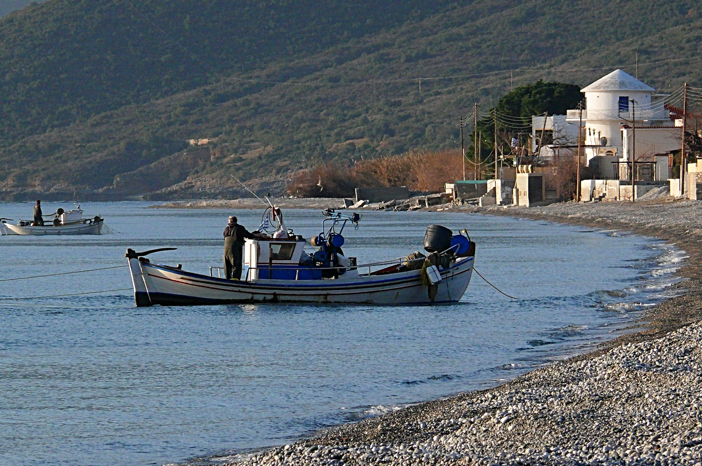 Abych si trochu zlepšil dojem, vracím se na Limeri na hezký bouldr v šedé skále Symmoria ext., 8a – prodloužení pohodového 6b. Pokus už nedávám, chvátáme koupit vařič a zakempit. Kupujeme ten největší, co měli, a k němu rovnou tři bomby – abysme náhodou neměli hlad. Večer spokojení vaříme na pláži první těstoviny s cuketou a čaj. O vínu není třeba se zmiňovat, mají ho jako všude na jihu skvělé.