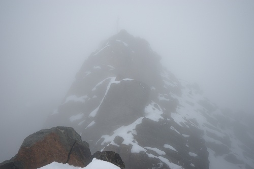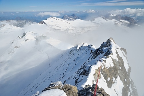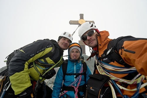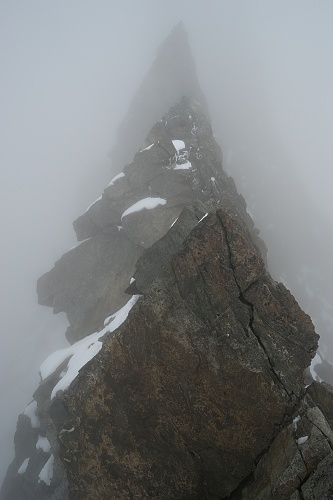 Před Glocknerscharte se bohužel slunečné počasí mění na mlhu a tato nás doprovází zbytek dne (a noci). Naštěstí se z hřebenu nedá příliš uhnout, tak přes Čertův a Zvoníkův roh vystoupíme na vrchol Grossglockneru.