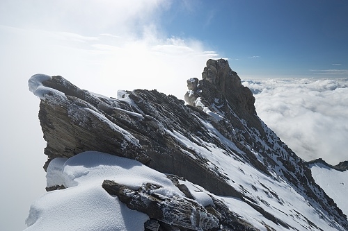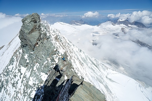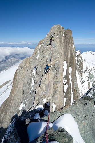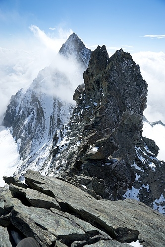 Zde začíná samotný hřeben, který ke Glocknerscharte čítá sedm turmů a špitzů, vzácně vyrovnaných do výše 3710 až 3721 metrů. Samozřejmě, tyto jsou odděleny hřebeny, hřebínky, sedly, sedýlky, štěrbinami a štěrbinkami furt nahoru- dolů. Skála různé kvality, občas břidlicový šrot, jindy pěkná pevná rula. Navíc máme nasněženo, tak to lezeme celé v mačkách.