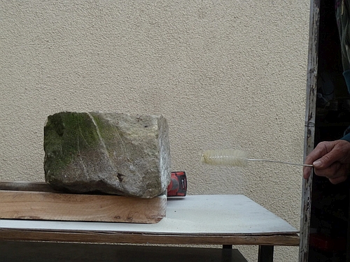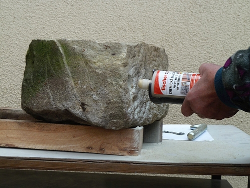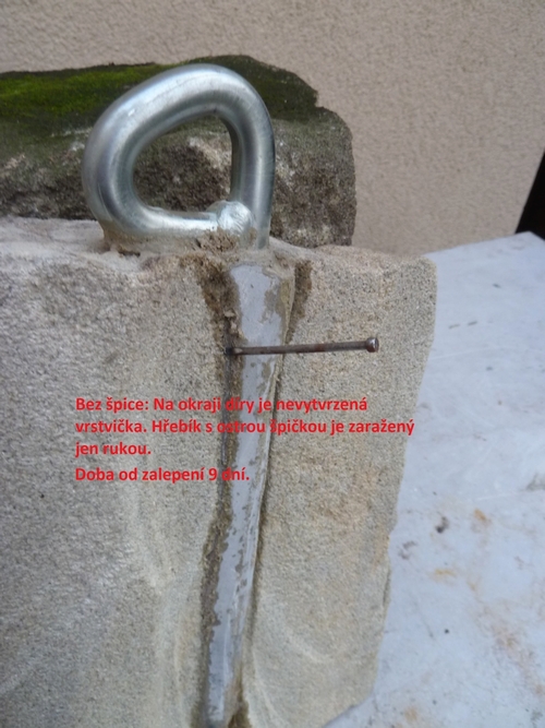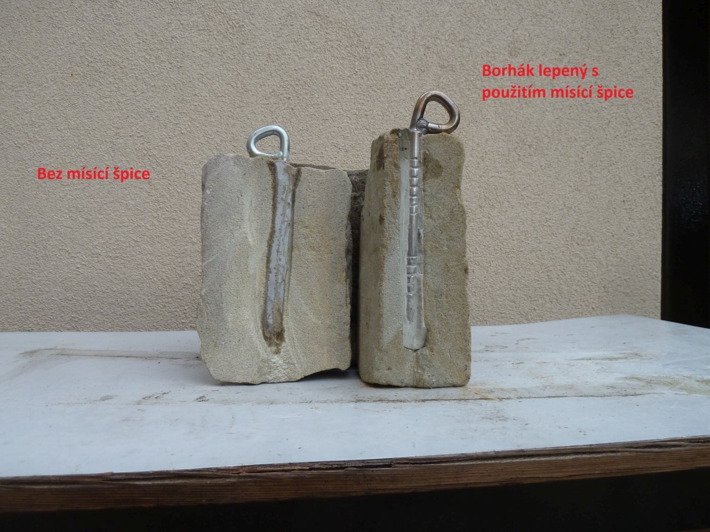 Vzhledem k tomuto výsledku byla provedena další zkouška, lepení borháku do bloku pískovce bez použití mísící špičky.
