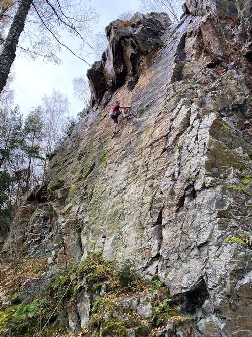 K lezení zde vám bude stačit jen sada expresek a 40 m lano. Kdo by se chtěl přijistit, tak vklíněnce s sebou, je zde solidní množství trhlin a spár. Materiál je velmi zajímavý a řekl bych, že i příjemný do ruky. Je tvořen ordovickými a kambrickými vrstvami, připomínající jakoby mnohem známější buližník s hrubější texturou.