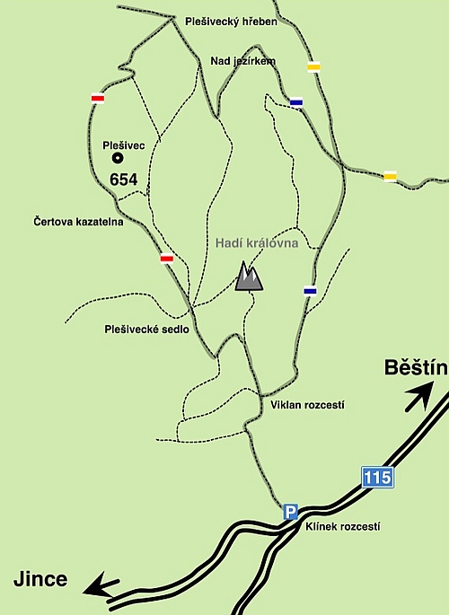 a) z rozcestí v sedle Klínek (zastávka (ČSAD) na silnici Jince -Hostomice doleva po červené značce cca 1,4 km po lesní silničce k rozcestníku značek v Plešiveckém sedle. Odtud po pěšince doprava nad skály v jižním úbočí. Ke skále Hadí královny též přímo z lesní silničky (cca 900 m od Klínku) málo znatelnou pěšinkou lesem doprava;