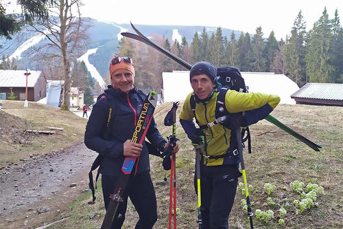 První etapa patřila lyžím. Já prohnal osvědčené Fischer TransAlp 82 Carbon osazené vázáním Plum Pika, které jsou i přes nízkou váhu natolik tuhé, že jsem si na nich troufnul i do nejstrmějších tatranských žlabů. Na nohy jsem si natáhl lyžáky Fischer Traverse, lehké a přitom tuhé botky, které mají rozsah pohybu v kloubu až 80°. Kája zvolila minimalistický závodní set složený z bot La Sportiva Raceborg, lyží La Sportiva Gara Aero LS 70  a vázání Plum Race 99 o hmotnosti páru pouhých 198 g. Tahle kombinace je tak lehounká, že s ní na kopec vyběhnete raz dva.