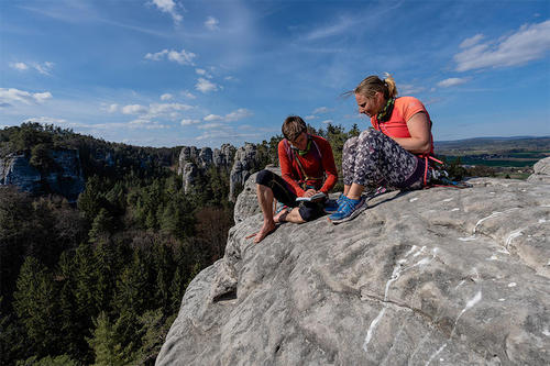 Dnes je prý moderní nosit každou lezečku jinou, tak jsem si na jednu nohu natáhl La Sportiva Skwama a na druhou zase Miura Women téže značky. Pravda, ne zrovna úmyslně. Při lezení jsme krom lana a další výstroje spoléhali na vybavení české provenience, třeba sedáky Rock Empire 3B Slight a expresky Rock Empire Rock Pack Racer P16."