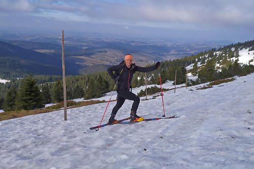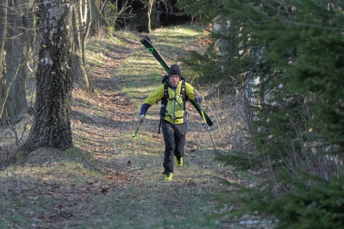 U kamenů sundáváme pásy a frčíme přes Kotelské sedlo na Dvoračky. Pod sedlem zima znatelně ztrácí na síle. Pravda, však tomu taky letos moc nedala. Kličkujeme po úzkém vysněženém chodníčku. Na sjezdovce pod Dvoračkami vyřízneme několik posledních obloučků a najedeme na Vlčí cestu. Chvíle bruslení a lyže musí definitivně na batoh. Sbíháme v lyžákách až na františkovskou silnici.