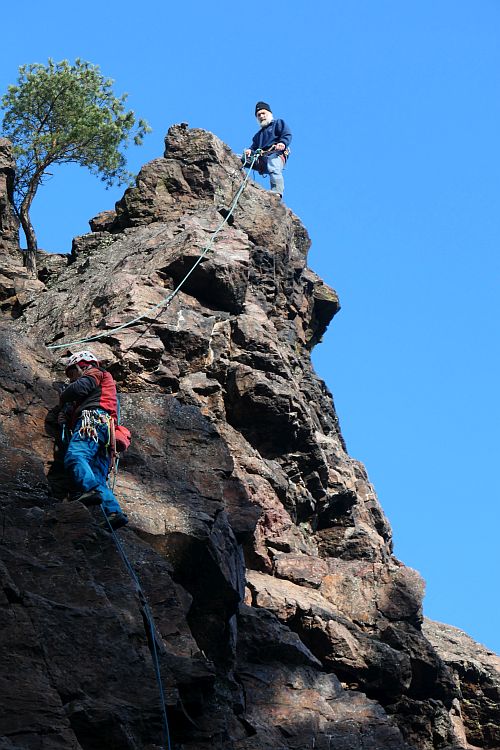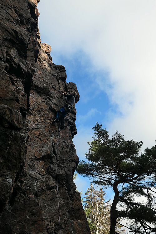 A i když Radyňské skály ráno skály skropil déšť, nakonec se lezlo o stošest. Byl to pěkný půl den.