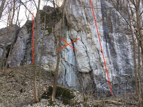 Stěny u Sloupské jeskyně – horní patro cesty Neplatná a Potměšilý domácí.