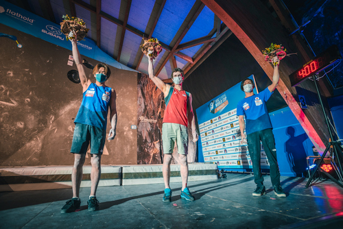 Adam Ondra, stupně vítězů na Světovém poháru v boulderingu v Meiringenu 2021 (foto: Petr Chodura)